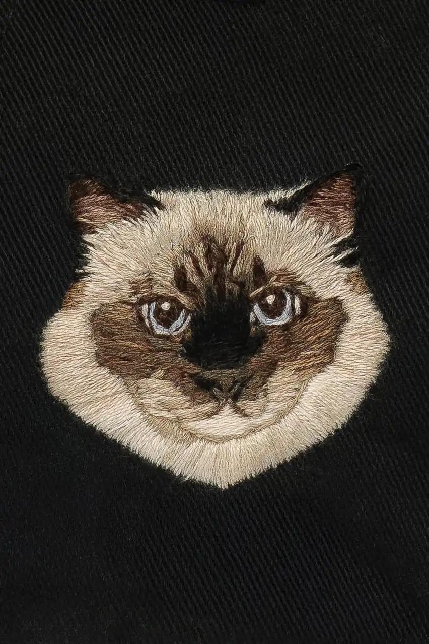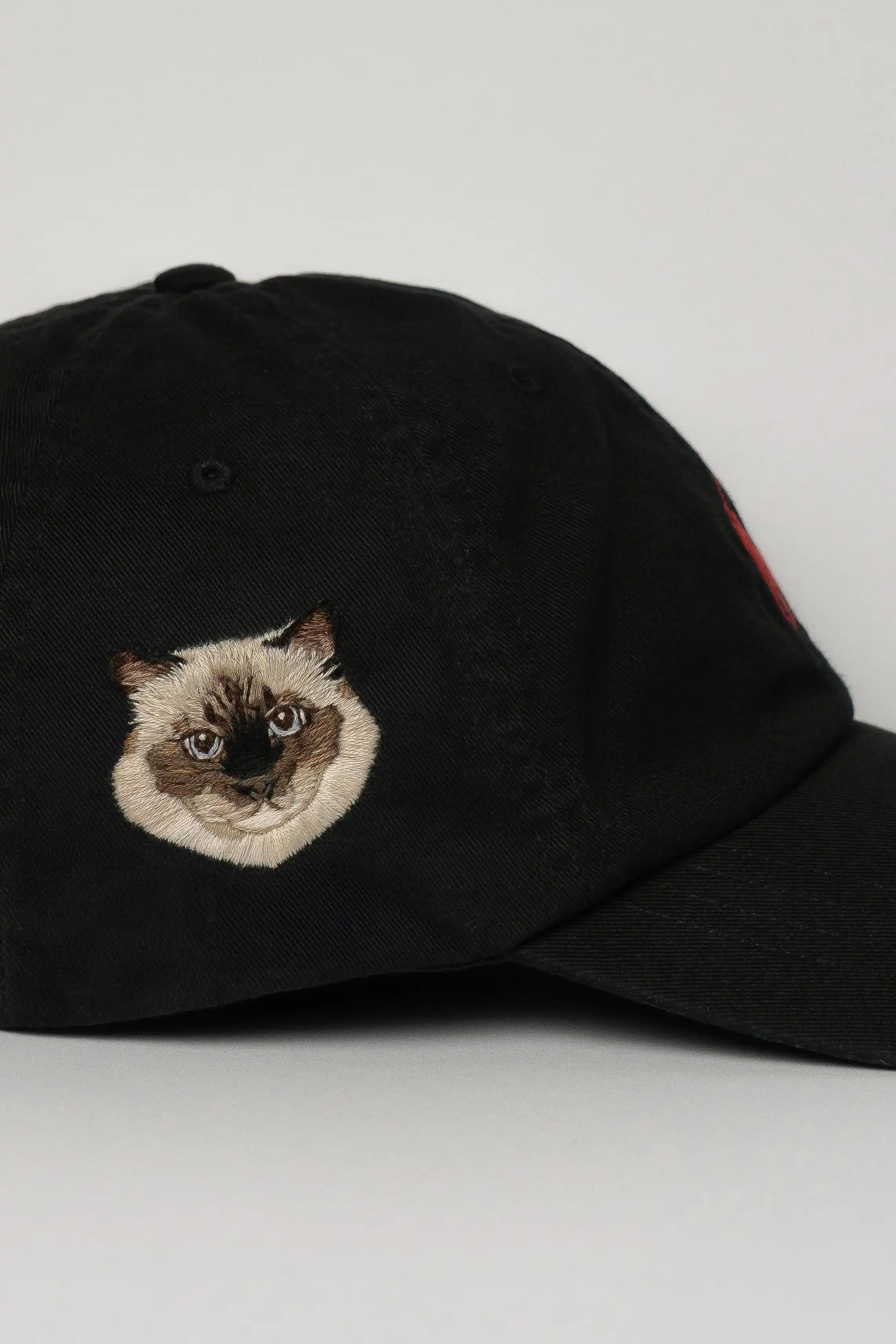 2025. Egyptian cotton thread (DMC) on Ralph Lauren cap, polo black/rl red. 27 thread colors. © Beatrice Seck.