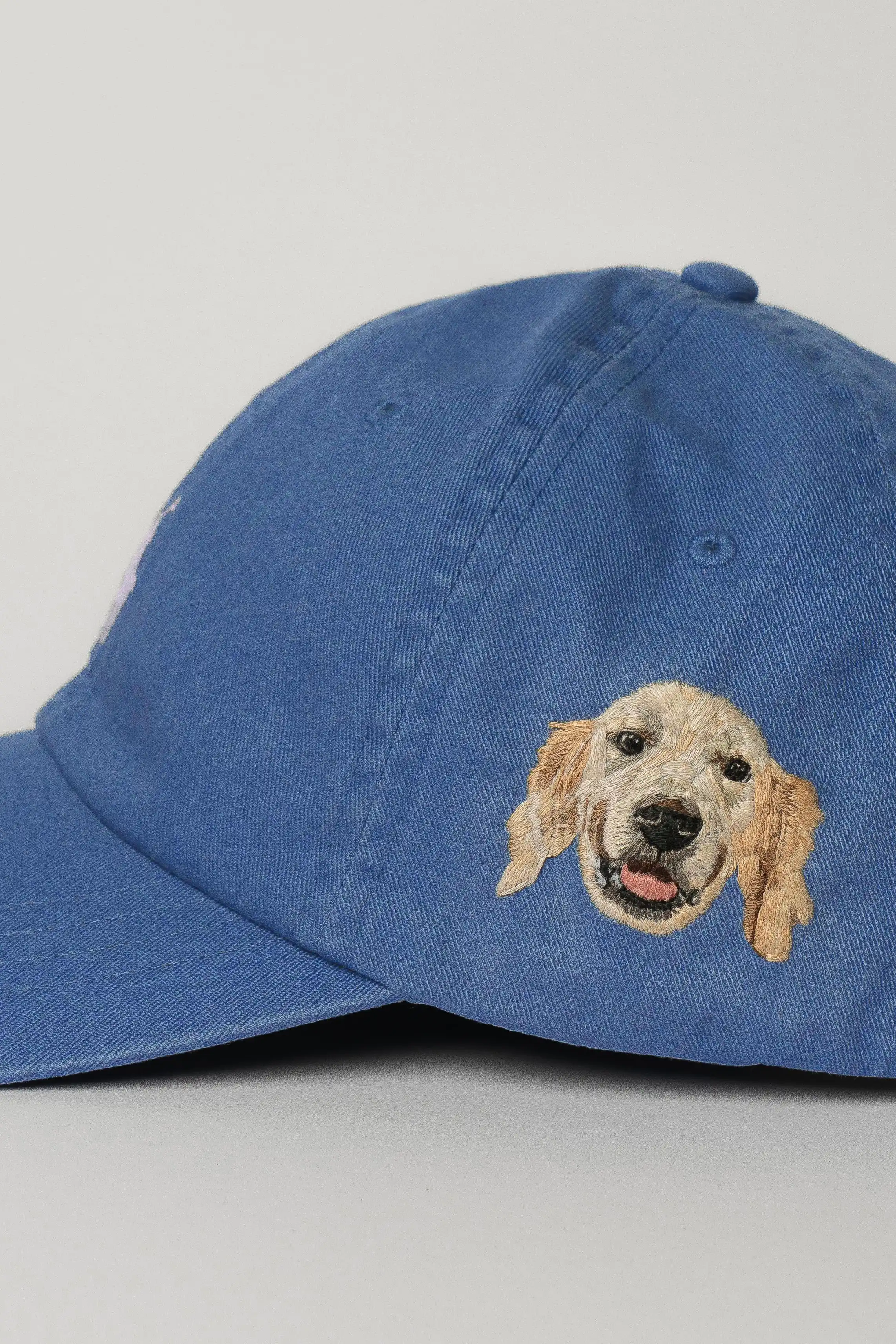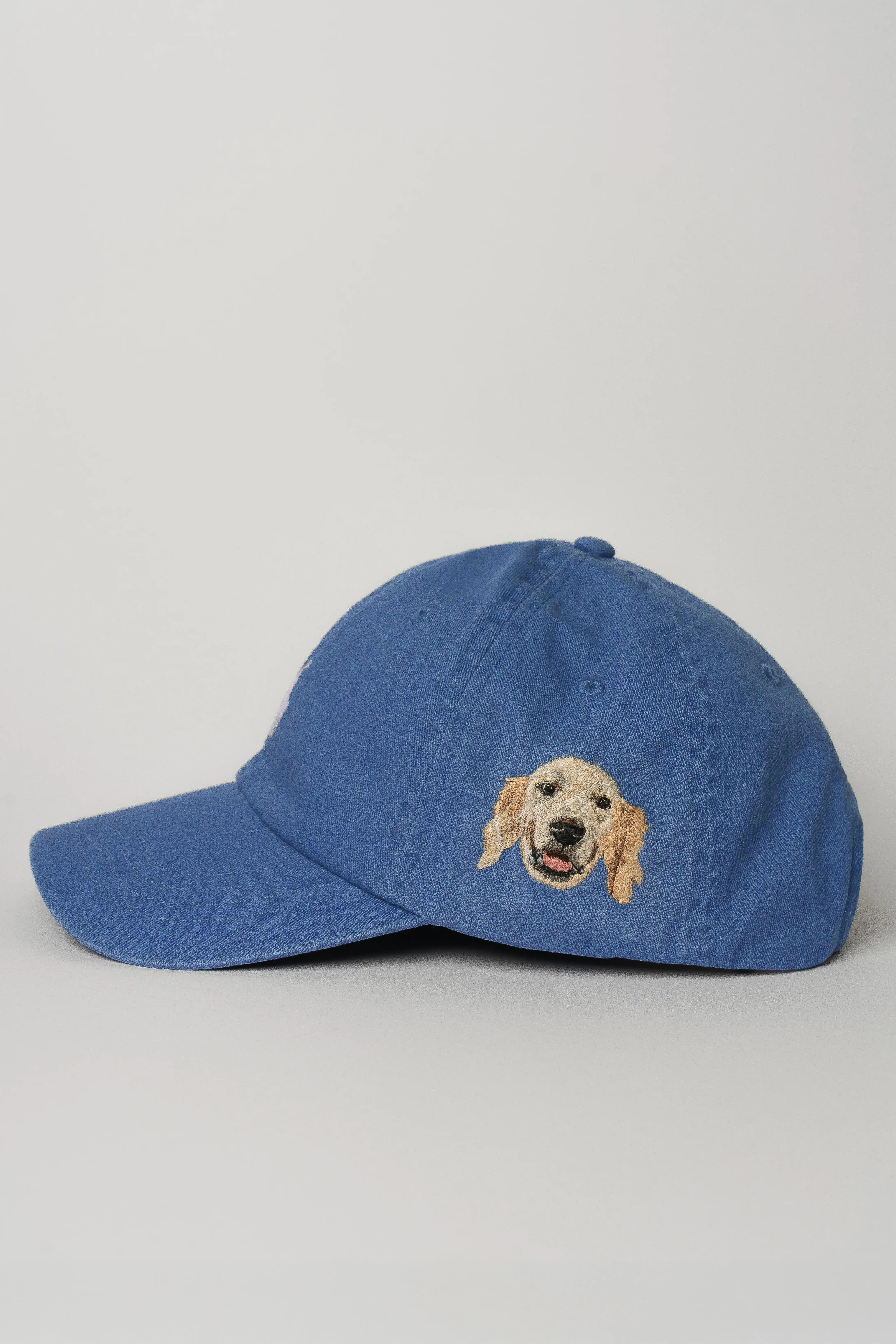 2025. Egyptian cotton thread (DMC) on Ralph Lauren cap, old royal. 26 thread colors. © Beatrice Seck.